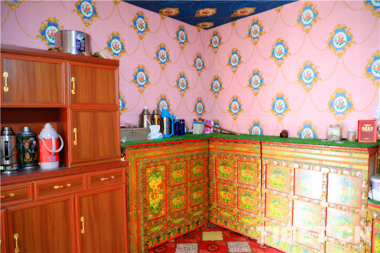 旦增卓措不僅希望自己的村子干干凈凈的,還將自家房屋安排得整潔舒適。她的房屋不大,但是都是自己親自裝扮。不大的客廳,從天花板到地面,都裝飾成自己喜歡的顏色,粉紅色的墻紙將女生的小浪漫展現無遺;沙發的靠背和窗簾的帷幕都是精致的流蘇或蕾絲;藏式家具擦拭得干干凈凈,水壺、熱水器、水杯、紙巾都擺放得整整齊齊……一眼望去,誰不夸贊一句“精致girl”。