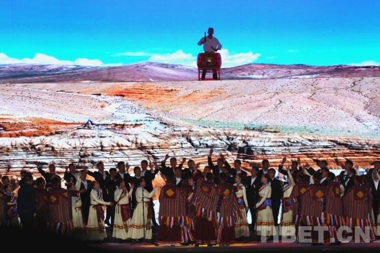 隨后盛大的開幕式文藝演出如期而至。演出共分為《悠遠(yuǎn)古韻》《詩意微芒》《如炬經(jīng)典》《輝煌盛世》四個(gè)篇章。《悠遠(yuǎn)古韻》篇章為大型情景表演,結(jié)合古格壁畫為開場(chǎng)表演,展現(xiàn)出阿里人民群眾的精神面貌和獨(dú)特的阿里神韻?!对娨馕⒚ⅰ穮R集阿里地區(qū)諸多極具代表性的國(guó)家級(jí)非物質(zhì)文化遺產(chǎn)節(jié)目,展現(xiàn)阿里地區(qū)悠久燦爛的古代文明遺存?!度缇娼?jīng)典》篇章通過不同舞蹈,展現(xiàn)阿里獨(dú)具特色的民間歌舞文化?!妒⑹老腋琛穭t展現(xiàn)了阿里地區(qū)以熱情昂揚(yáng)的姿態(tài)在全力以赴推動(dòng)建設(shè)雪域高原“西部明珠”中取得的一系列可喜的成績(jī)。
