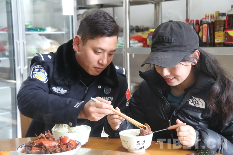 氧氣瓶、高原藥品、熱水......接德吉永措的車上已準備好了各種抗高反和取暖的東西,這讓她提前感受到了來自丈夫單位的熱情與關懷。與愛人相聚后,旦增洛追帶著妻子參觀營區,迫切地想讓她了解他用青春為之奮斗的警營,隨后他又帶著妻子到單位食堂品嘗自己親自下廚做的紅燒肉。“嗯!味道很好?!钡录来氤灾煞蚪o她夾的肉,臉上洋溢著幸福的笑容。
