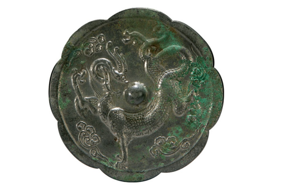 此件青銅龍紋鏡為葵花形,鏡背以紐為中心,龍紋為單體,呈蟠曲狀,四周分布云紋。龍的長角翹起,巨口張開,身體遒勁,脖頸細長,似在回首戲珠。唐代有帝王在千秋節向群臣頒賜銅鏡之俗,這種賜予臣下的銅鏡多以龍紋裝飾,稱千秋鏡或天子鏡。也許是天子所賜,所以此龍的姿態看上去遒勁有力,同時又顯得生動活潑,仿佛在每日的使用中能給人以活力。(中國西藏網綜合/周晶)