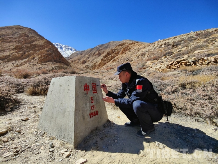 巡邏結(jié)束回到執(zhí)勤點(diǎn)后,邊巴次仁并沒有卸下執(zhí)勤裝備,而是拿著毛筆和紅油漆朝著執(zhí)勤點(diǎn)的河對(duì)岸走去,過河幾百米便是中尼5號(hào)界樁。“只有堅(jiān)守在邊境的我們才能體驗(yàn)到,除夕這天,為界碑描紅的自豪感。”他拿出毛筆跟紅漆一筆一劃地描著界碑上的每一個(gè)字。“描紅界碑那一刻,眼前是界碑,身后是祖國,我們守的是萬家燈火。”邊巴次仁眼神堅(jiān)定地看著身前的界碑說。