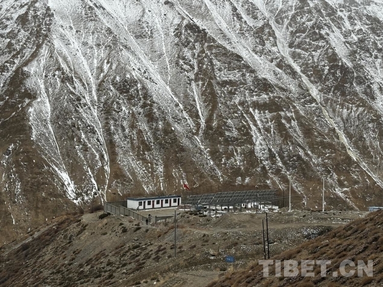 圖為斜爾瓦執勤點民警冒著風雪在中尼7號界樁旁巡邏踏查 攝影:格熱