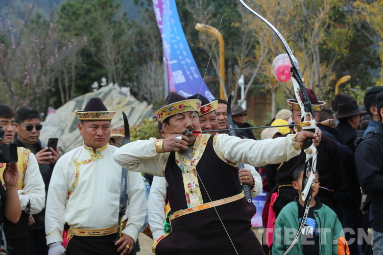 一陣“比嗚”聲從工布天街公園傳出,大家鼓掌喝彩。這里是民俗競技體驗區最熱鬧的工布響箭比賽現場,工布響箭藏語稱“畢秀”,是西藏自治區林芝市特有的一項民間傳統體育競賽項目,距今已有1500多年歷史,被列入西藏第二批自治區級非物質文化遺產名錄,是林芝慶祝豐收、迎接新年等重要節慶活動時必不可少的體育娛樂活動。