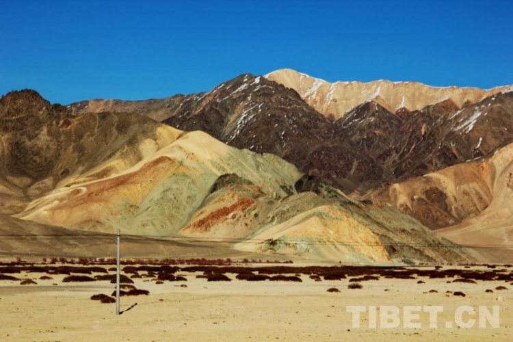 阿里地區地形復雜多樣,大致分為高原湖盆區、高山寬谷區、高山峽谷區三種形態。高海拔、高寒、日照時間長且輻射強等自然條件,使得阿里地區不僅擁有雄渾壯麗的高原風光,而且隨海拔、光照、季節、山體巖層所含礦物質種類等因素呈現出色彩繽紛的變化。圖為阿里地區噶爾縣一處多彩的山體 攝影:劉莉