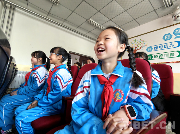 圖為4月23日,西藏自治區新華書店在拉薩市城關區海淀小學開展的“享受閱讀 讓夢飛翔”閱讀校園行活動互動環節,有趣的互動把小學生給逗樂了 攝影:次旦拉姆