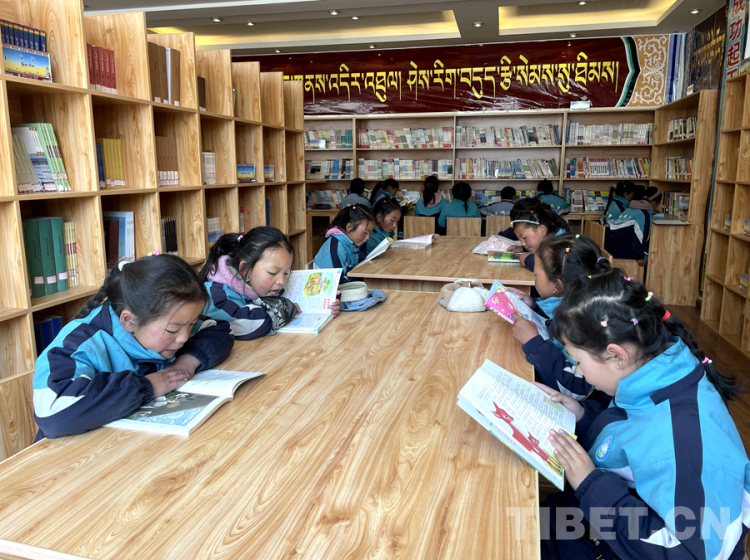 圖為4月23日,在西藏日喀則市薩迦縣雄麥鄉中心小學圖書館內,小學生們在閱讀書籍 攝影:頓珠次仁