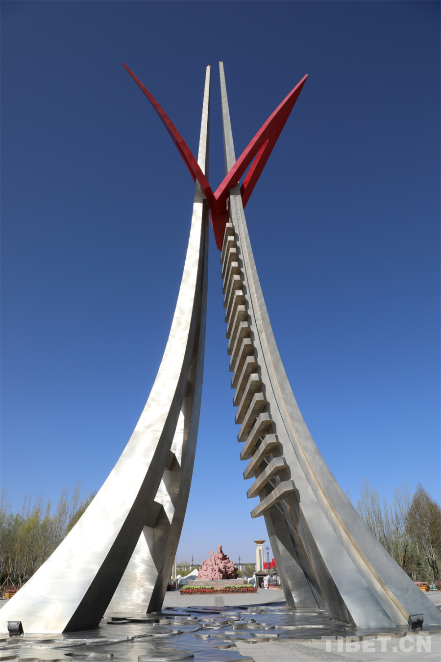 雕塑之后便是公園內的標志性建筑——天路紀念塔,呈人字形高聳,延伸的線條分別代表著青藏公路和青藏鐵路,塔座是青藏地形圖和兩條線路的示意圖。據了解,此塔高39.16米,數據取自青藏公路和青藏鐵路里程之和3916公里。