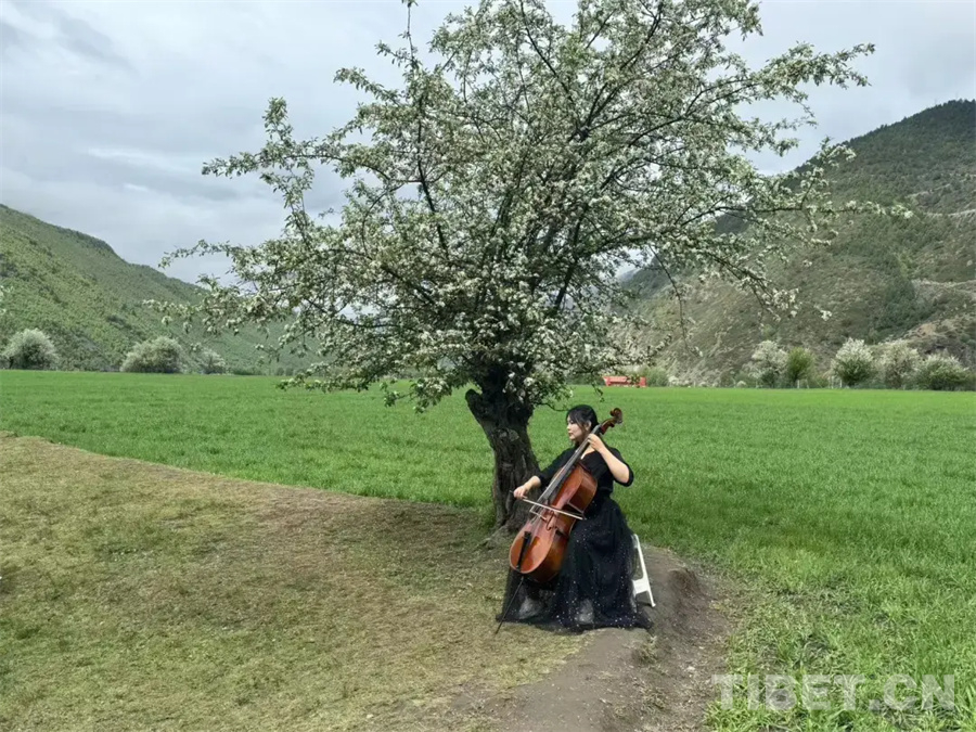 悠揚的樂聲自林間傳來,沿著步道往深處走去,一場特別的演奏會正在進行。枝頭海棠盛放,樹下游人如織,鋼琴、大提琴、笛子等各色樂器奏出的曲調在貢嘎海棠的映襯下更顯別樣風味,來自西安的韓先生細細聆聽木雅傳統(tǒng)非遺口弦的演奏后不禁感嘆道,“太美了!這個活動將音樂與貢嘎海棠花海巧妙融合,讓我感受到一種別樣的人與自然共生的和諧。”