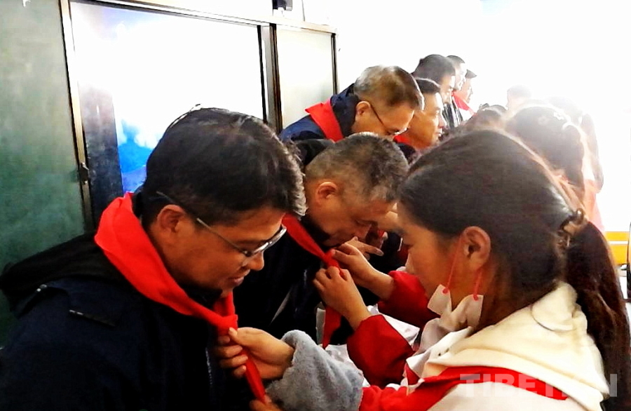 圖為四川省甘孜州石渠縣第二完全小學學生為醫療專家們獻上鮮艷的紅領巾 攝影:劉莉