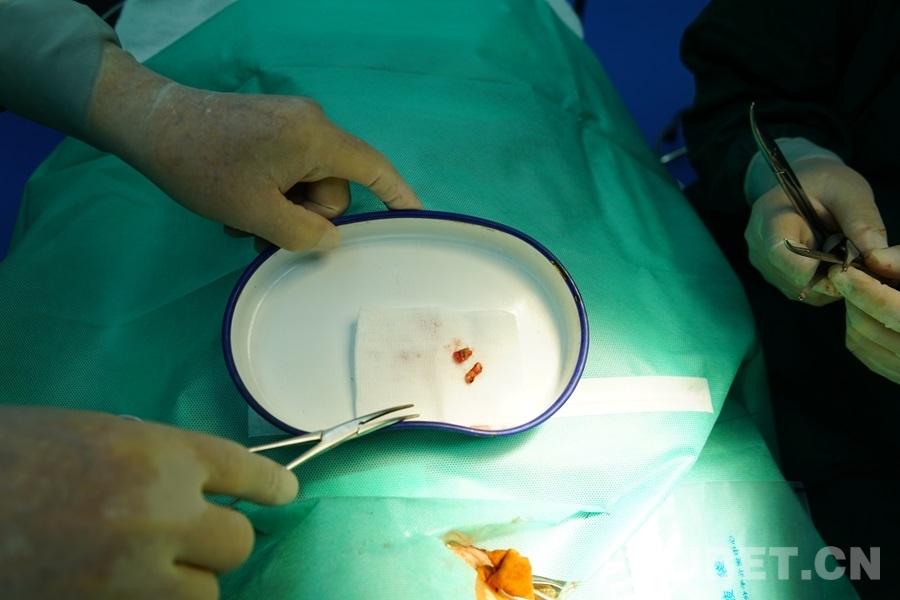 王貴懷、魏希發兩位專家于下午四點半左右從義診現場抵達白玉縣人民醫院,會同縣人民醫院院長李治宏,一起為患兒做了切除手術,異物成功取出,并在隨后安排了病理檢查。手術完成后,孩子父母為醫生們獻上哈達,表達自己的感激之情。