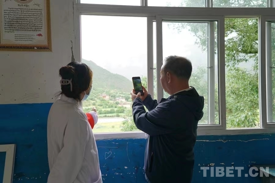 圖為上午義診結束后,四郎曲珍為魏希發介紹當地的風景 攝影:周晴晴