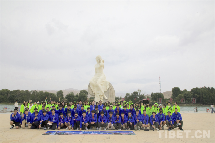 圖為香港交流團(tuán)青少年在貴德黃河少女雕塑前合影留念 攝影:桑吉