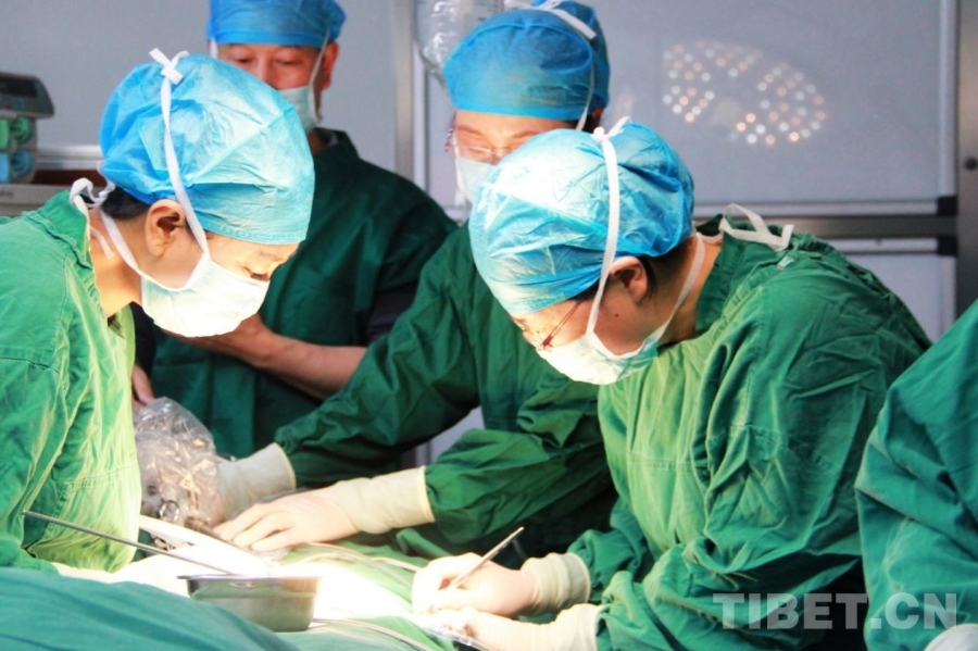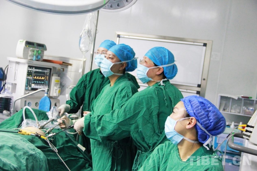 圖為航空總醫院婦科主任余立群(右二)在手術中指導甘孜縣人民醫院醫生操作手術 攝影:劉莉