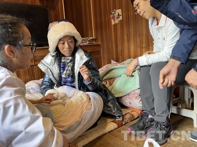 在義診活動進行的同時,幾位專家還分撥前往貧困家庭慰問。其中,北京地壇醫院的中醫科副主任楊玉英,北京地壇醫院婦科副主任劉軍,北京老年醫院呼吸科副主任劉前桂,北京大學第一醫院骨科副主任徐貝宇一行來到了離措拉鎮不遠的德西村山坡上,去阿珍家慰問看診。據了解,阿珍的母親沖曲措于 2019 年進行了胃癌手術,術后做了五次化療,于 2020 年末完成化療。然而,2024 年 6 月份,沖曲措又被查出患有肺炎。由于吃不下飯,沖曲措體重嚴重下降,營養嚴重不良。。