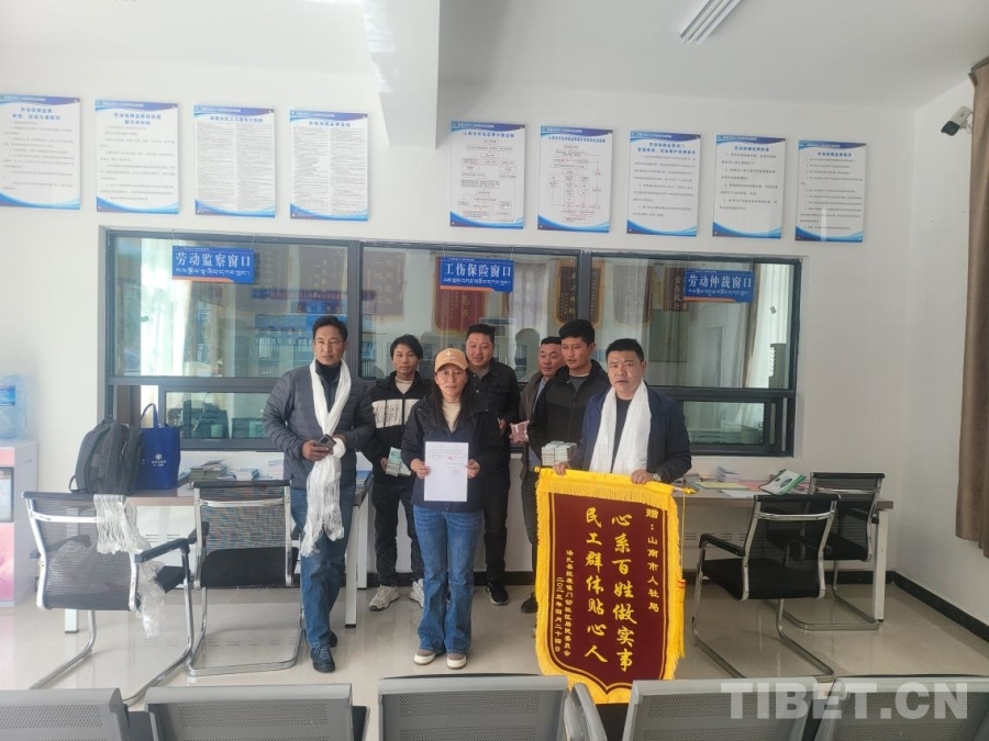 圖為山南市人社局為農民工追回血汗錢,獲贈群眾錦旗