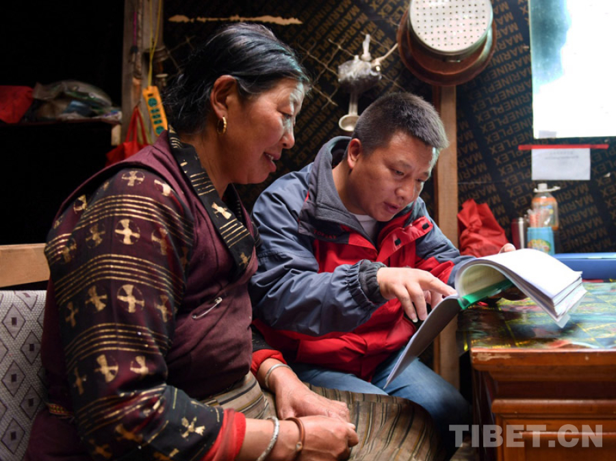 圖為山南市社保工作人員在玉麥鄉玉麥村村民央宗家中進行社保信息補充登記,普及社保政策