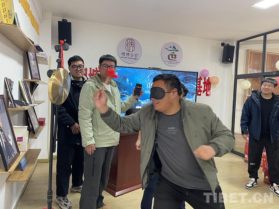 猜燈謎、投壺、蒙眼敲鑼等活動相繼舉行,現場熱鬧非凡。投壺是中國古代一種博弈助興的游藝,專技人才們參與積極性極高,紛紛尋找角度,穩住心態,瞄準壺口投射,投中者贏得陣陣掌聲;蒙眼敲鑼的環節將本次活動推向了高潮,大家自由結對,接力在蒙住雙眼的條件下,僅憑借隊友的引導敲響銅鑼。