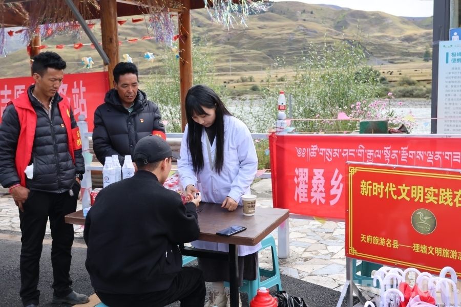 從海拔4700多米的卡子拉山,到一派田園風光的濯桑片區;從傳統文化氣息濃厚的勒通古鎮,到一望無際的毛埡大草原,理塘縣共設立了19處新時代文明實踐旅游服務站,每處站點都配備了至少5名志愿者,從9點到18點,全天提供指路問詢、文明旅游宣傳、血氧飽和度測量以及免費開水、免費雨傘、應急充電等志愿服務,并協助交警開展交通安全宣傳、文明行車引導等工作。