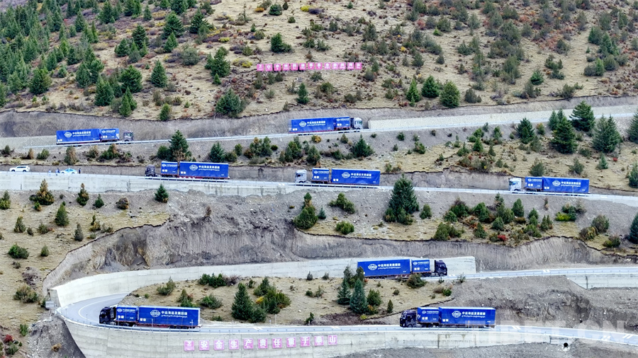 圖為中遠海運集團2024年援建的西藏自治區昌都市洛隆縣臘久鄉第一小學集裝箱食堂正運輸行駛在國道G349等道路上