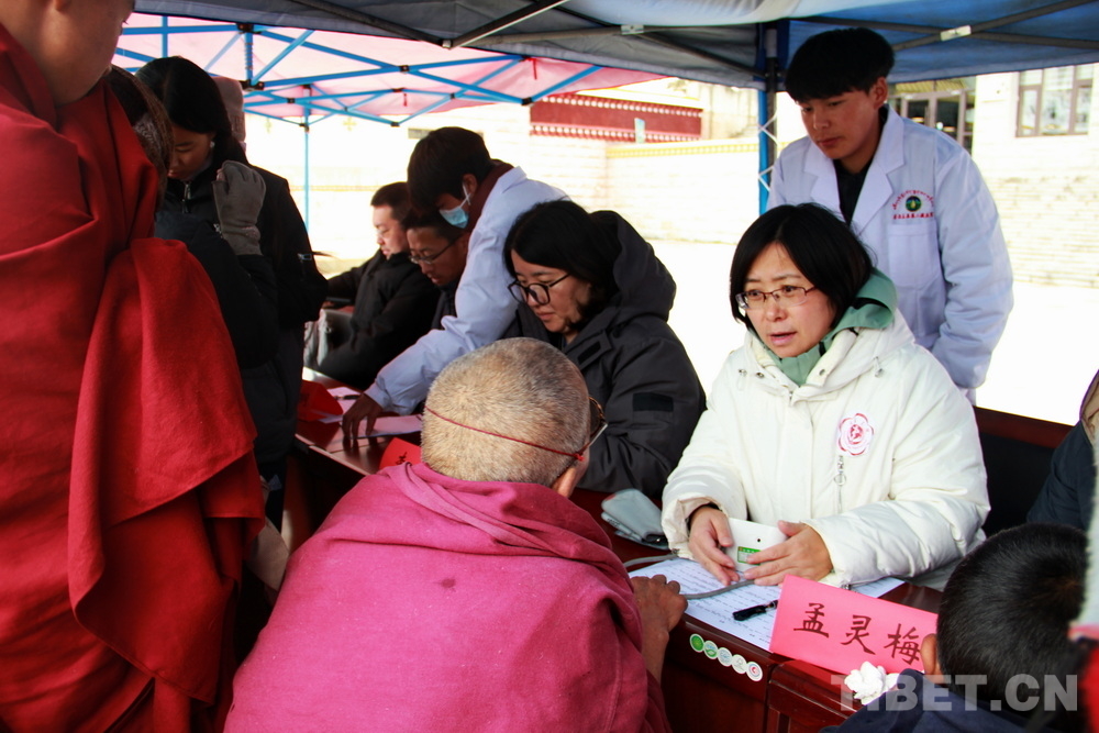 在郎木寺義診點,此前為了容納更多群眾就診,因此將義診點設(shè)在了寺院門外的小廣場。盡管大雪紛飛,但提前得知義診消息的群眾已經(jīng)陸續(xù)趕來,擔(dān)心臨時更換義診場所影響后續(xù)前來的群眾就診,醫(yī)務(wù)志愿者們毫無怨言地在臨時搭起的防雨棚下按時開始了義診。