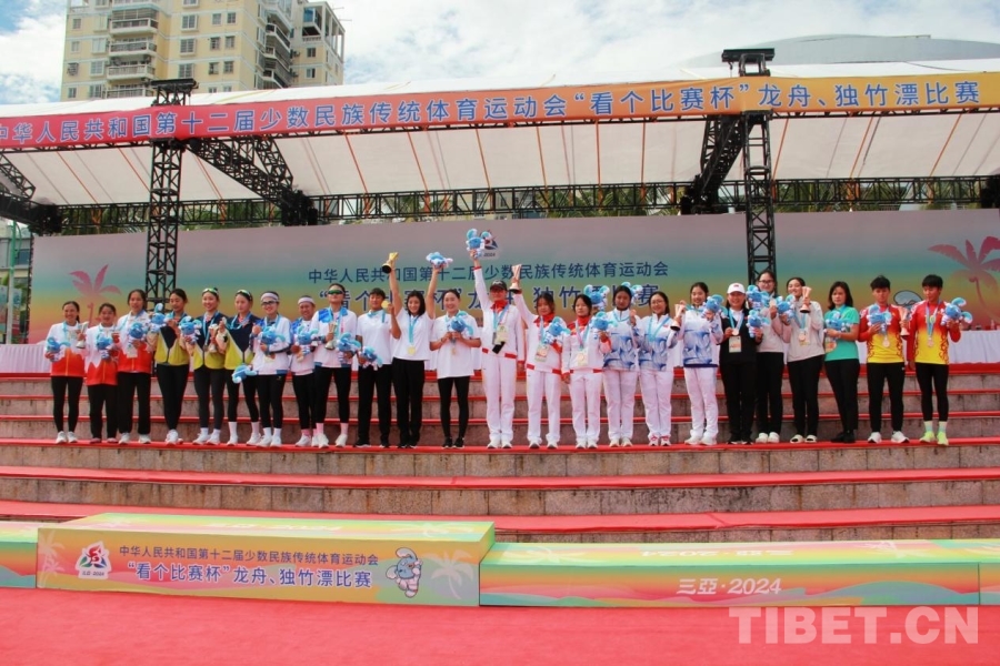 圖為第十二屆全國少數民族傳統體育運動會1000米標準龍舟女子組頒獎儀式 攝影:劉莉