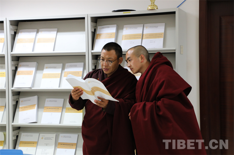 學員們在環境雅致、設施完善的中國藏語系高級佛學院圖書館里“打卡”。該圖書館擁有豐富的藏文文獻資源,為學員們提供了舒適的交流場所和學習環境。西藏佛學院的學員們也紛紛投入知識的海洋進行閱覽。