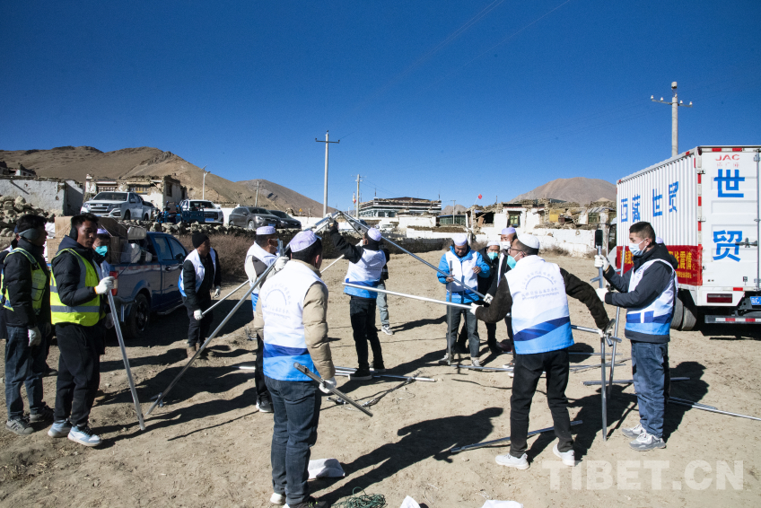 圖為在左措村地震安置點現場,山南市乃東區甘肅青海企業家商會愛心人士正在搭建物資發放帳篷 攝影:趙振宇