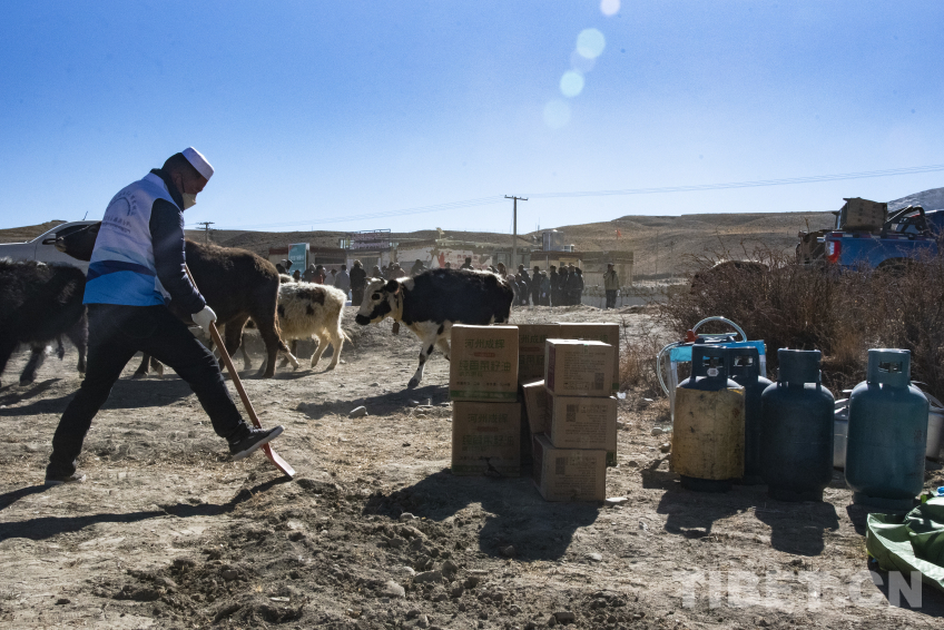 圖為在左措村地震安置點現場,山南市乃東區甘肅青海企業家商會愛心人士正在平整土地準備為受災群眾做飯 攝影:趙振宇