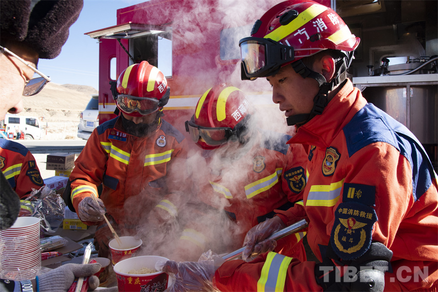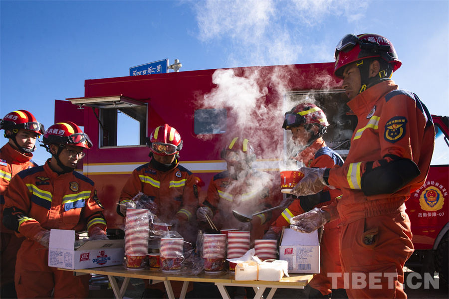 圖為山南市消防救援支隊消防員在受災安置點前發放熱餐 攝影:趙振宇