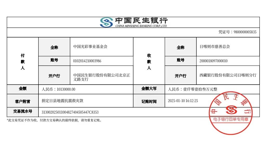 圖為中國光彩事業基金會捐款回單(其中一筆) 中國光彩事業基金會供圖