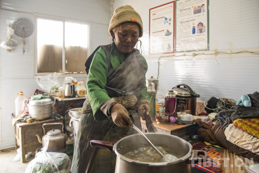 圖為曲珍老人正在安置板房內(nèi)準(zhǔn)備“古突” 攝影:趙振宇