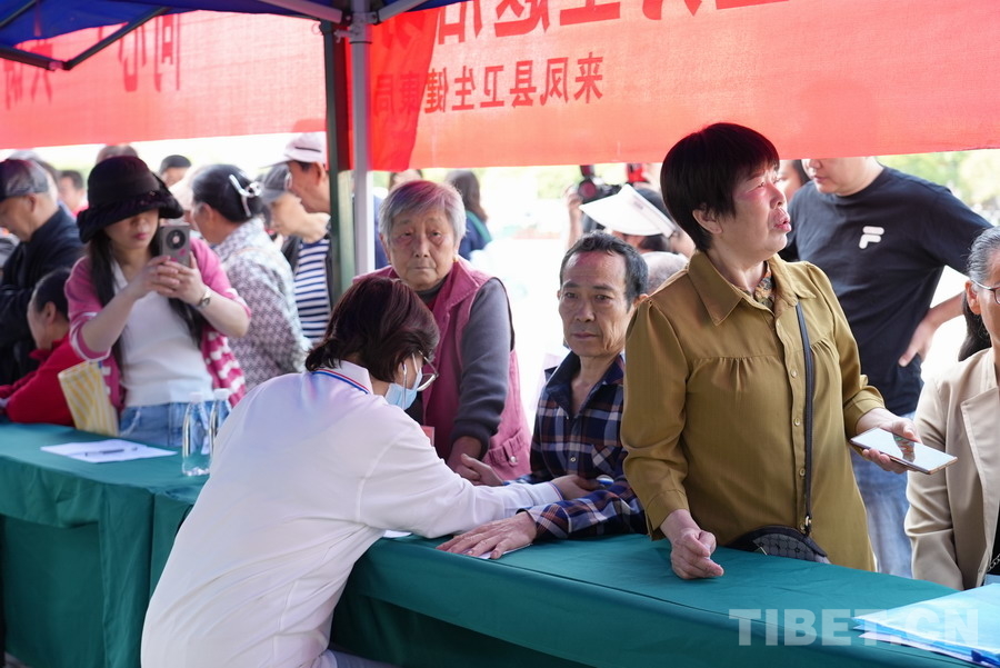 中國西藏網訊 4月18日,“同心·共鑄中國心”大型公益醫療服務活動走進湖北省恩施土家族苗族自治州來鳳縣。來自北京的10名醫療專家組成的聯合義診團隊,在喳西泰廣場為當地群眾提供健康咨詢、疾病篩查及個性化診療服務。活動現場,專家們耐心解答群眾健康問題,針對常見病、慢性病進行細致篩查,并提出專業診療建議。(中國西藏網 記者/蘇洋)