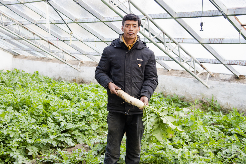 圖為定日縣長所鄉嘎旦村村委會主任頓珠在震后修繕的蔬菜溫室大棚內為記者展示棚內種植出的白蘿卜 攝影:趙振宇