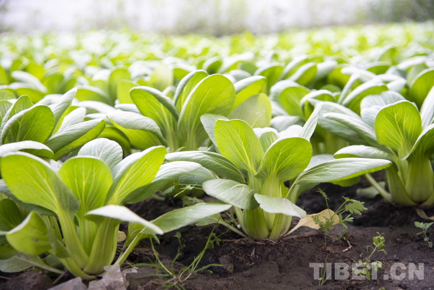 圖為定日縣長所鄉嘎旦村震后修繕的蔬菜溫室大棚內長勢正旺的綠葉菜 攝影:趙振宇