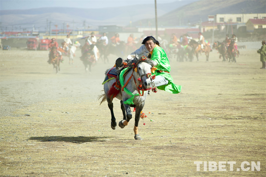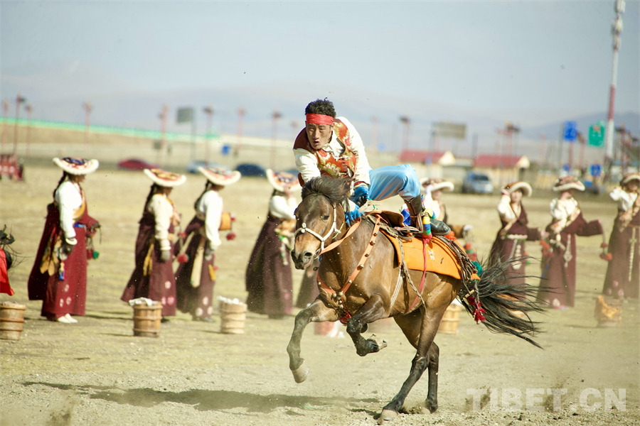 在海拔4000米左右的遼闊天地間,康巴漢子們駕馭著矯健的駿馬、身著華美的傳統服飾,如疾風般掠過金色的草原,在馬背上展示跑馬射箭、乘馬射擊、跑馬拾哈達、跑馬倒立、跑馬懸體等高難度動作,馬蹄聲聲、歡呼陣陣,交織成高原最豪邁的樂章。(中國西藏網 記者/畢然 龍真多吉)