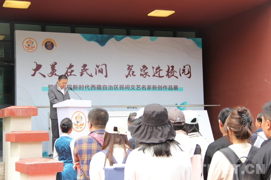 6月20日,“大美在民間——名家進校園暨第三屆新時代西藏自治區民間文藝名家新創作品展”開展。圖為西藏大學黨委常委、副校長王斌禮致辭 攝影:趙釗