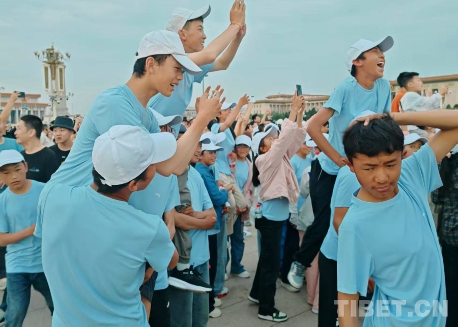 暑期的天安門廣場更加熱鬧,不僅有一家老幼同游的家庭,有旅行社帶來的各地旅游團,最多的是各種學校、團體組織的大大小小的學生團,他們身著不同顏色款式的服裝,共同等待著激動人心的時刻。“山河同脈·京華筑夢”研學團的少年們便是其中一員,他們穿著淺藍色的T恤,戴著白色的棒球帽,散發著西藏少年的朝氣。
