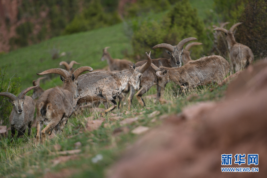 一群巖羊在青海省玉樹藏族自治州囊謙縣吉尼賽鄉河谷的山坡上嬉戲。(6月20日攝)新華網 潘彬彬 攝