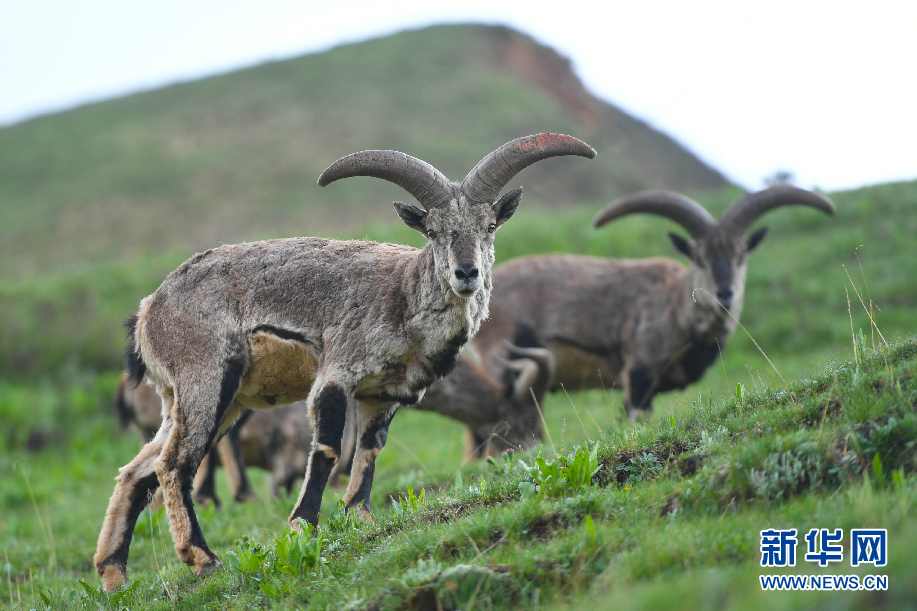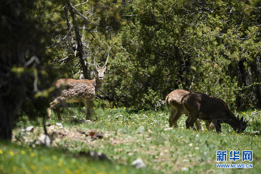 三只巖羊在囊謙縣吉尼賽鄉河谷的山坡上覓食。(6月20日攝)新華網 潘彬彬 攝