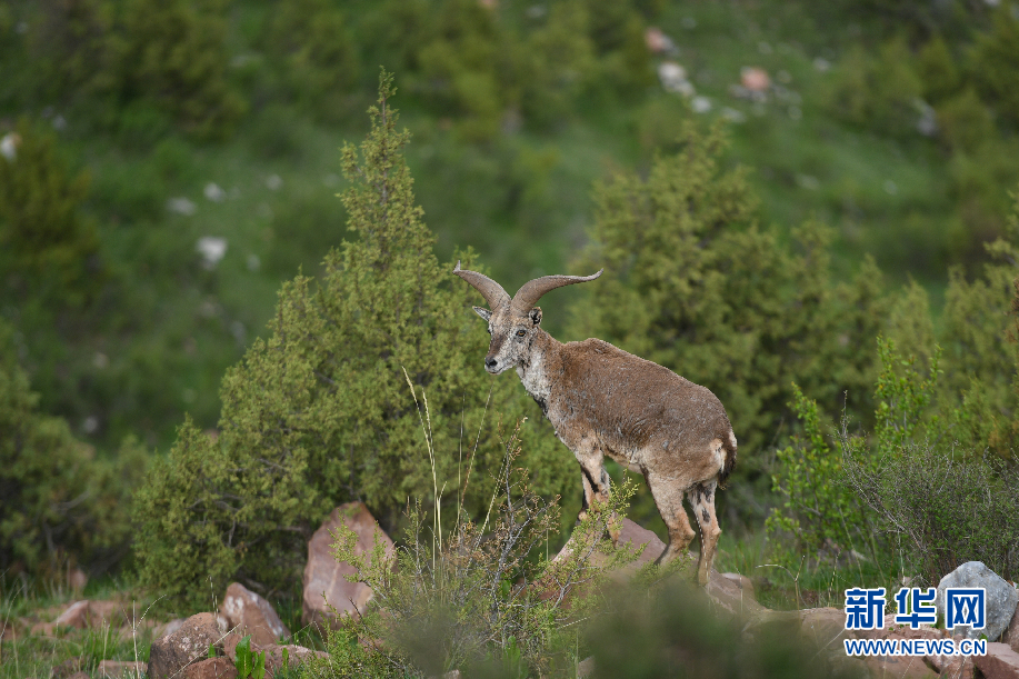 一只巖羊在囊謙縣吉尼賽鄉河谷的山坡上眺望。(6月20日攝)新華網 潘彬彬 攝