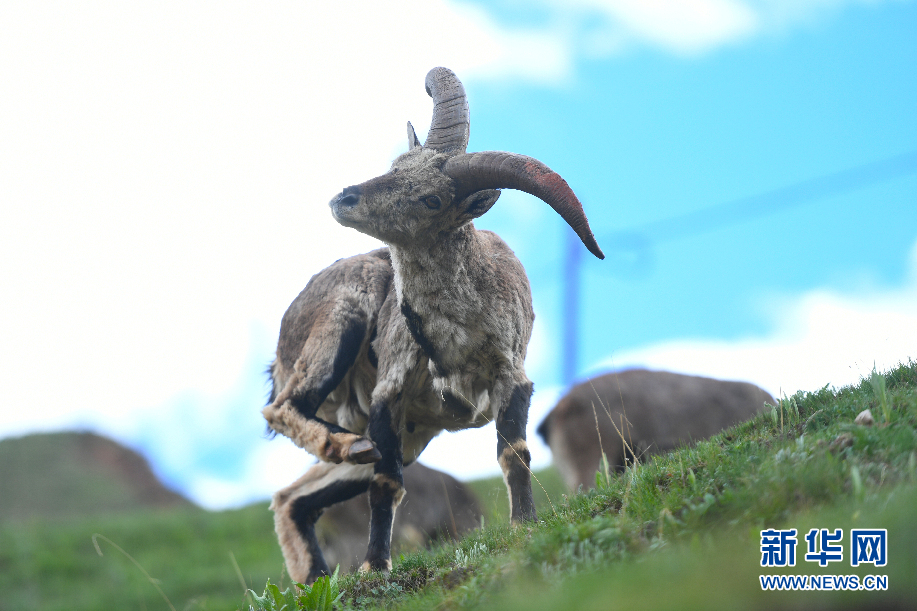 一只巖羊在囊謙縣吉尼賽鄉河谷的山坡上嬉戲。(6月20日攝)新華網 潘彬彬 攝