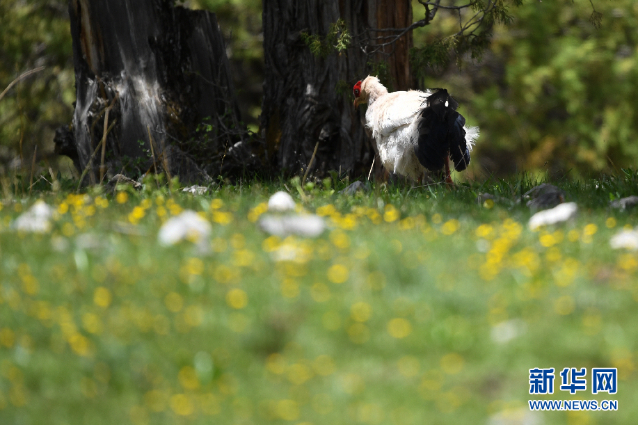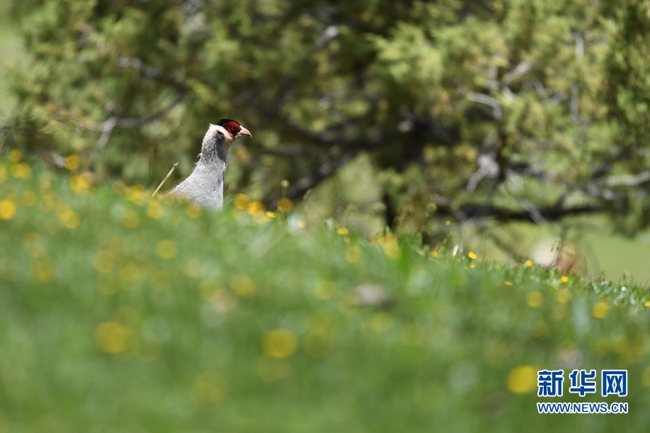 幾只白馬雞在囊謙縣吉尼賽鄉河谷的山坡上覓食。(6月20日攝)新華網 潘彬彬 攝