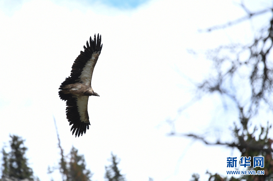 一只高山兀鷲在囊謙縣白扎鄉白扎林場上空飛翔。(6月21日攝)新華網 潘彬彬 攝