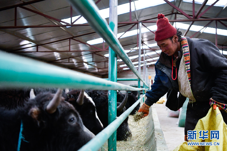 青海省黃南藏族自治州澤庫縣寧秀鄉拉格日村牧民多杰才旦在合作社的牛棚里喂牛(2019年1月17日攝)。新華社記者 張龍 攝