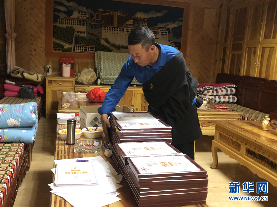 村民才保在家中整理運動員完賽證書。新華網 魚昊 攝