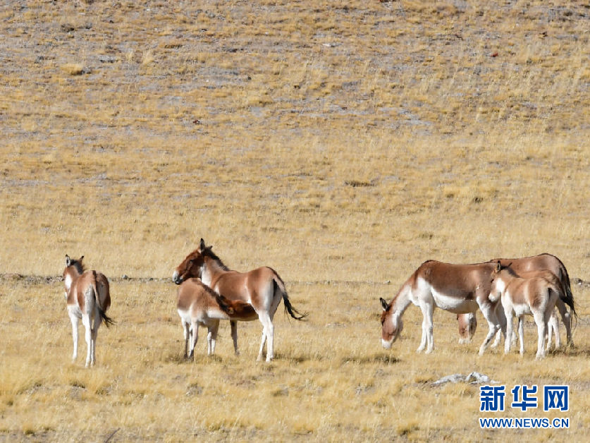 10月30日在青海省果洛藏族自治州瑪多縣境內拍攝的一群藏野驢。新華社記者 張龍 攝