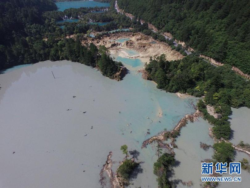 這是2017年九寨溝遭遇地震后的火花海景點(diǎn)(2017年8月9日攝,無人機(jī)照片)。新華社發(fā)