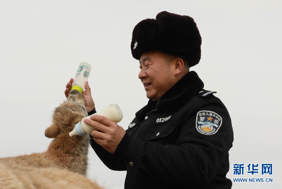 可可西里巡山隊員鄧海平給藏羚羊幼仔喂奶(12月6日攝)。新華社記者 藍翔 攝