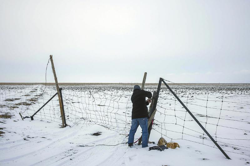 3月6日,若爾蓋濕地國家級自然保護區管理局生態護濕員如科冒雪清理棲息地周邊的隱患。尹鋼 攝