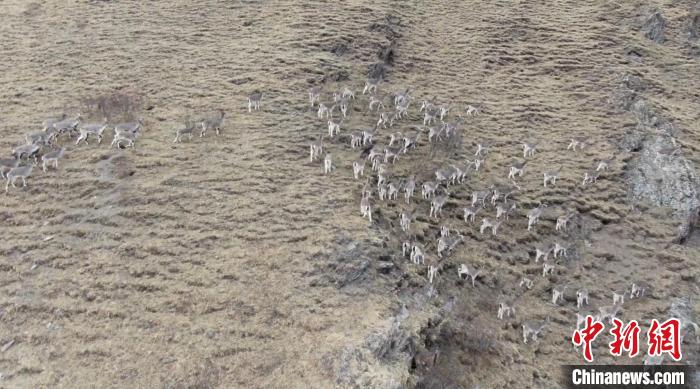 圖為航拍巖羊群在山坡上活動。曹民鍇 攝